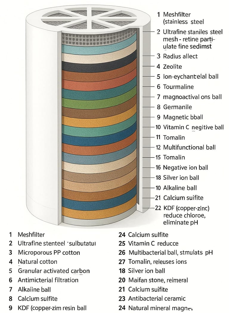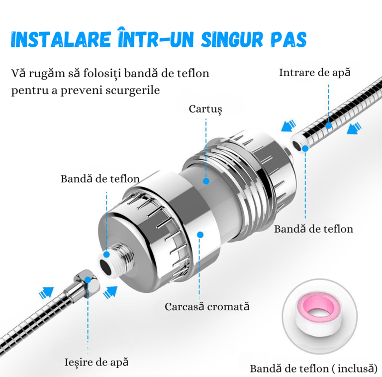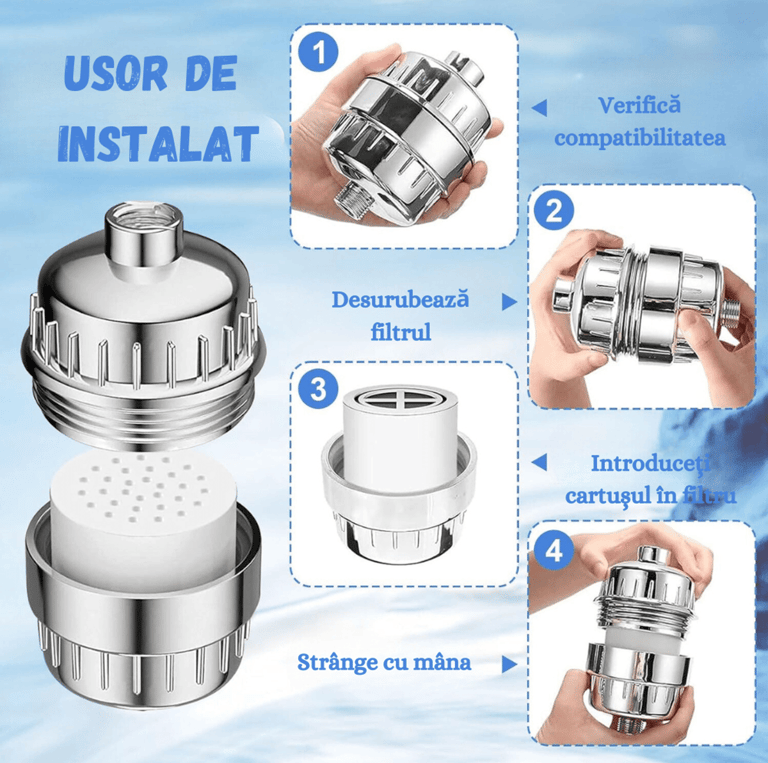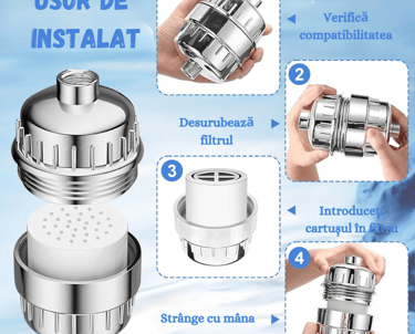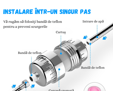 Montarea filtrului – Înșurubează filtrul pe brațul de duș, apoi atașează capul de duș la celălalt capăt al filtrului.